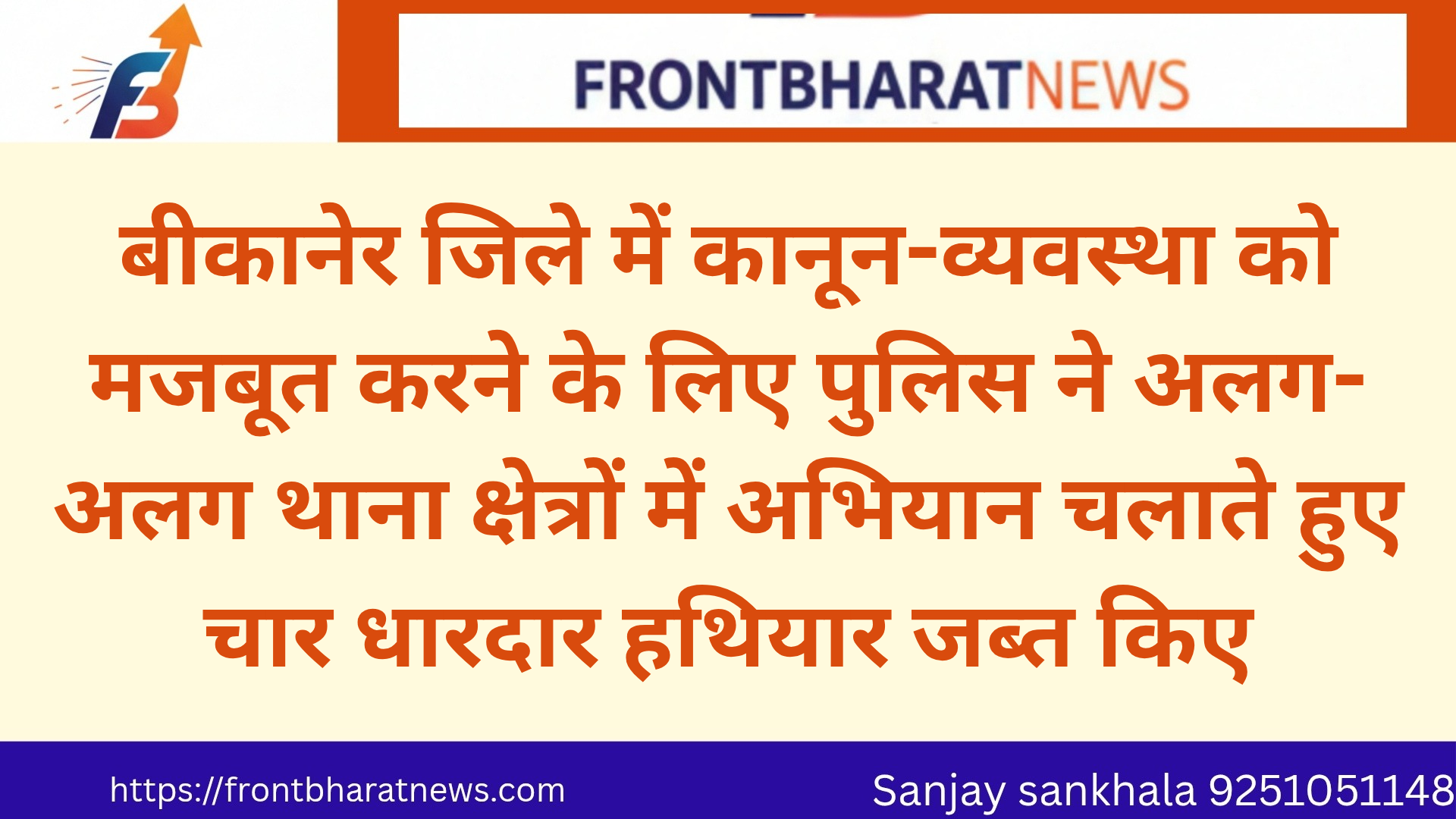 बीकानेर जिले में कानून-व्यवस्था को मजबूत करने के लिए पुलिस ने अलग-अलग थाना क्षेत्रों में अभियान चलाते हुए चार धारदार हथियार जब्त किए