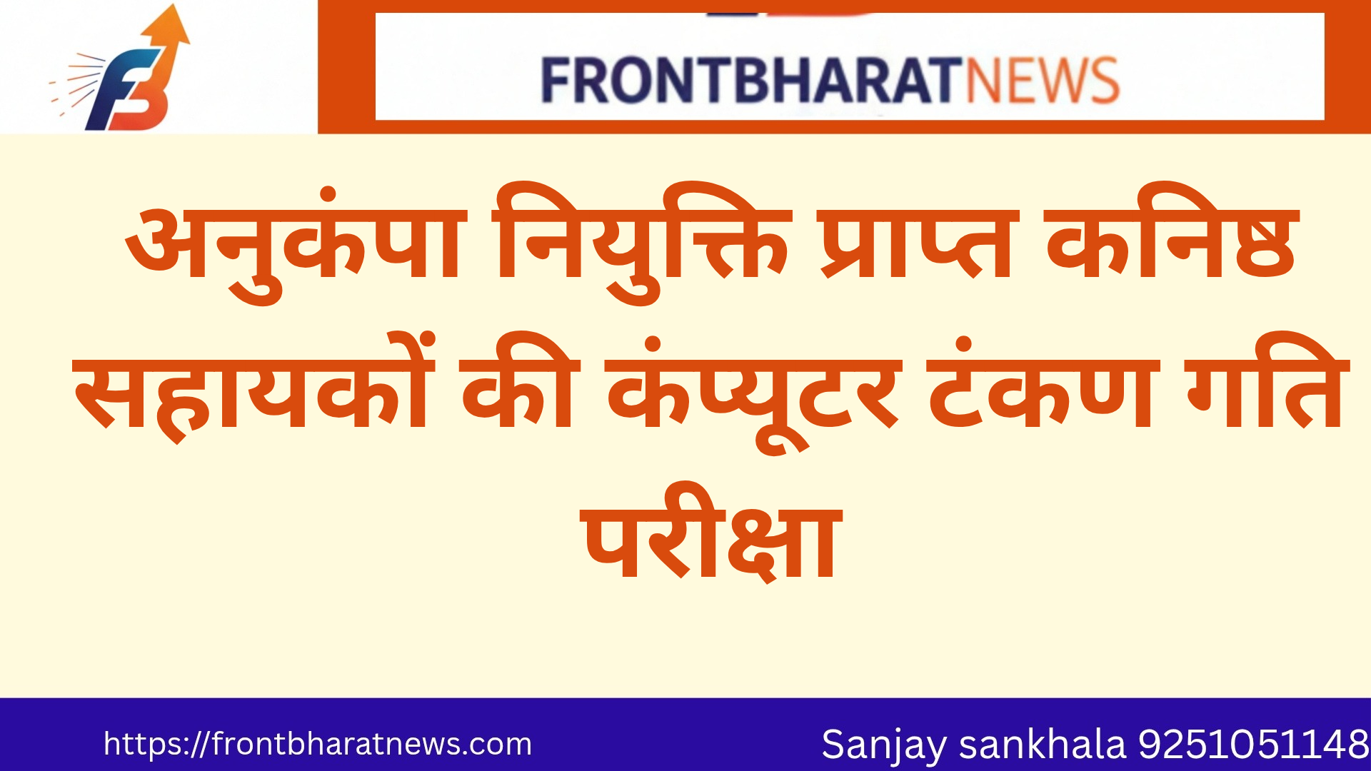 परीक्षा आयोजन समिति के अध्यक्ष एवं अतिरिक्त जिला कलक्टर (प्रशासन) सुरेश कुमार यादव ने बताया कि जिला स्तर पर द्वितीय अवसर के लिए अनुकम्पात्मक नियुक्ति प्राप्त कनिष्ठ सहायक, जो आगामी टंकण परीक्षा मई-2026 में शामिल होना चाहते हैं, वे कंप्यूटर टंकण परीक्षा आवेदन पत्र उचित माध्यम से 31 मार्च तक जिला कलेक्टर कार्यालय में आवश्यक रूप से जमा करवाएं, जिससे उन्हें द्वितीय अवसर की परीक्षा में शामिल किया जा सके।