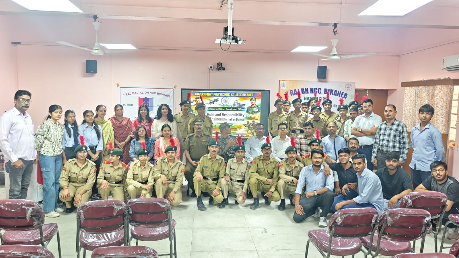 बीकानेर, 28 मार्च। राजकीय पॉलिटेक्निक महाविद्यालय में एनसीसी इकाई के तत्वावधान में ‘भारतीय सेना में इंजीनियर की भूमिका’ विषय पर विशेष व्याख्यान आयोजित किया गया। कार्यक्रम की शुरुआत माँ सरस्वती के चित्र पर दीप प्रज्ज्वल व पुष्पांजलि तथा सामूहिक रूप से राष्ट्रगीत वन्देमातरम का गायन के साथ हुई। एनसीसी प्रभारी मेजर एस. एल. राठी ने बताया कि इस व्याख्यान में मुख्य वक्ता मेजर एस. संग्राम, भर्ती चिकित्सा अधिकारी, सेना भर्ती कार्यालय (एआरओ), झुंझुनू थे जिनका प्राचार्य श्री के के सुथार ने माला पहनाकर व पौधा भेंट कर स्वागत किया।