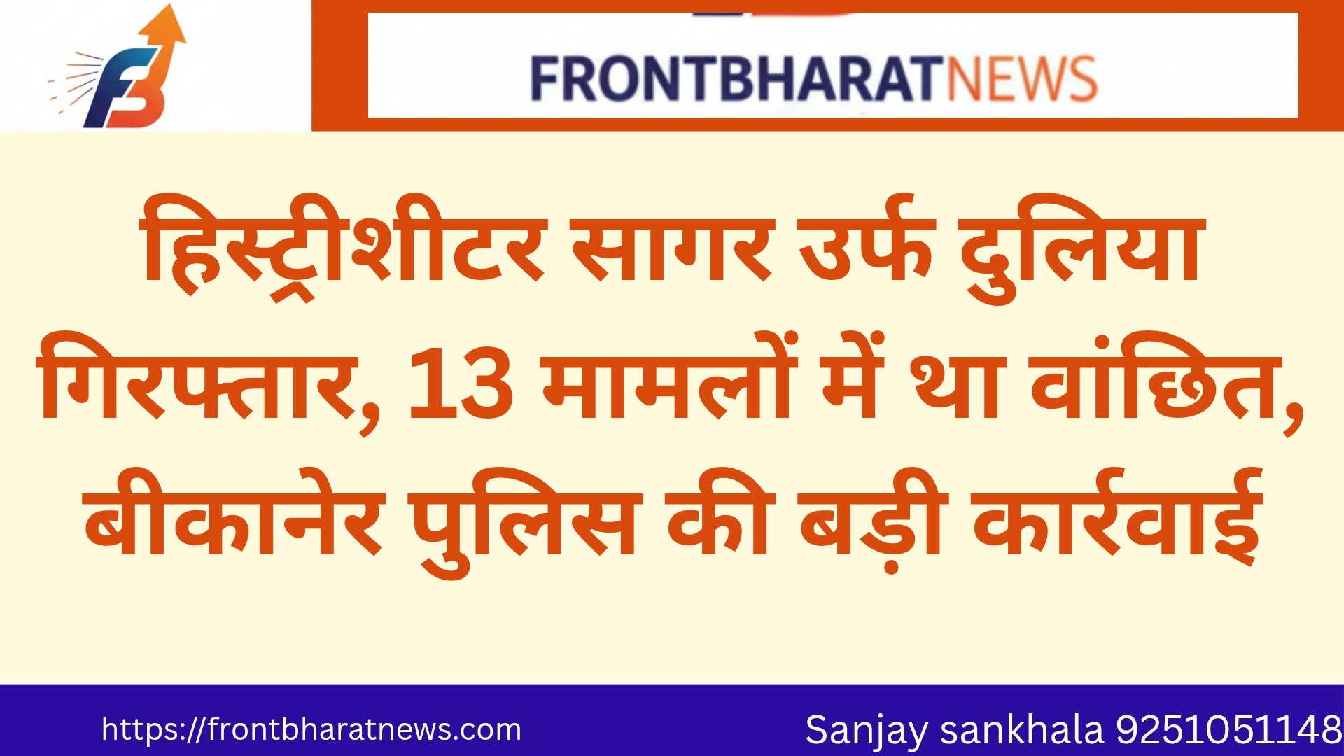 हिस्ट्रीशीटर सागर उर्फ दुलिया गिरफ्तार, 13 मामलों में था वांछित, बीकानेर पुलिस की बड़ी कार्रवाई
