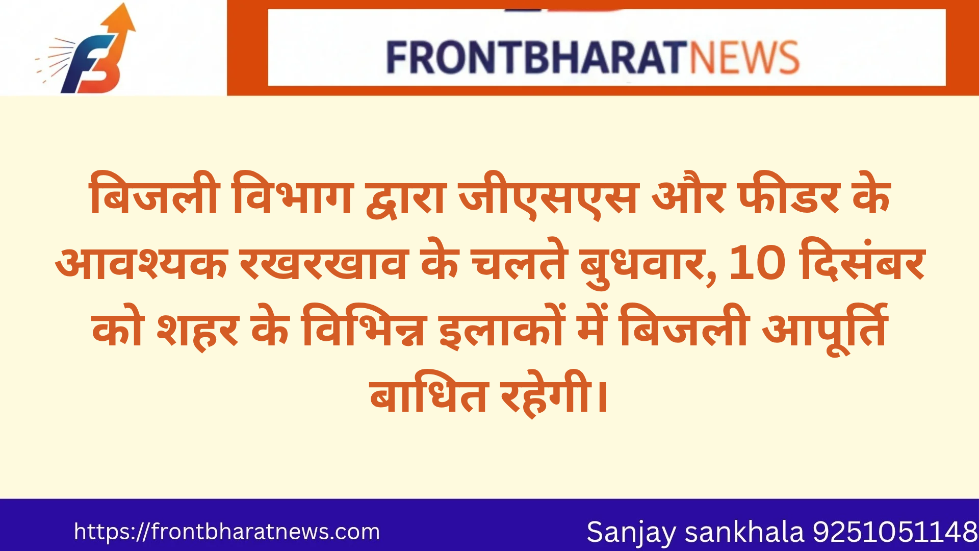 बिजली विभाग द्वारा जीएसएस और फीडर के आवश्यक रखरखाव के चलते बुधवार, 10 दिसंबर को शहर के विभिन्न इलाकों में बिजली आपूर्ति बाधित रहेगी। December 9, 2025 No Comments Read More »